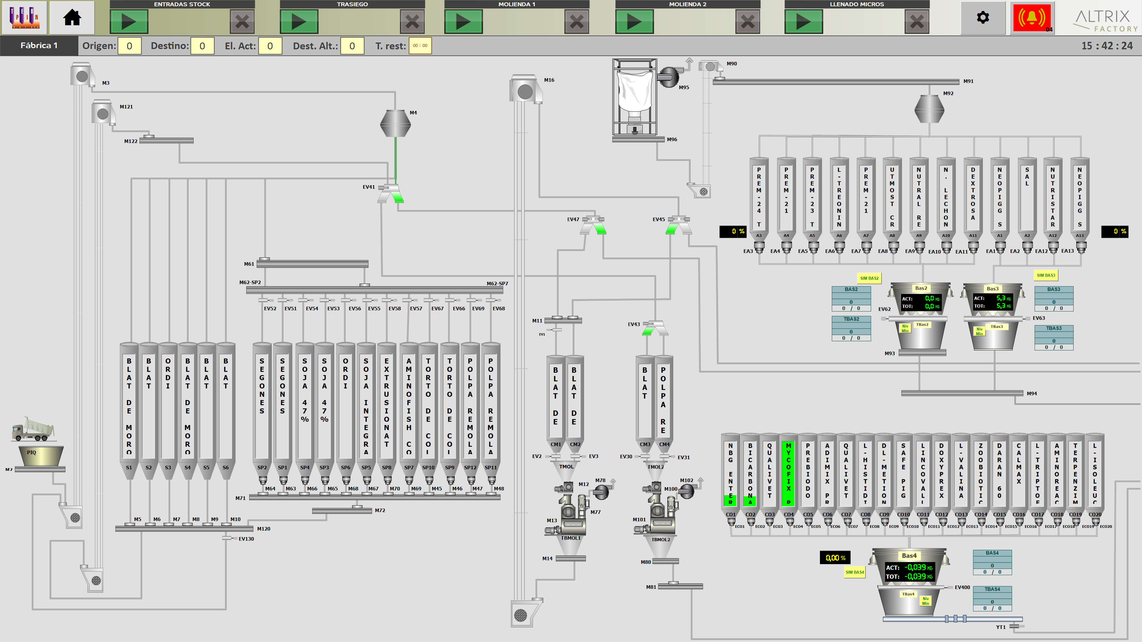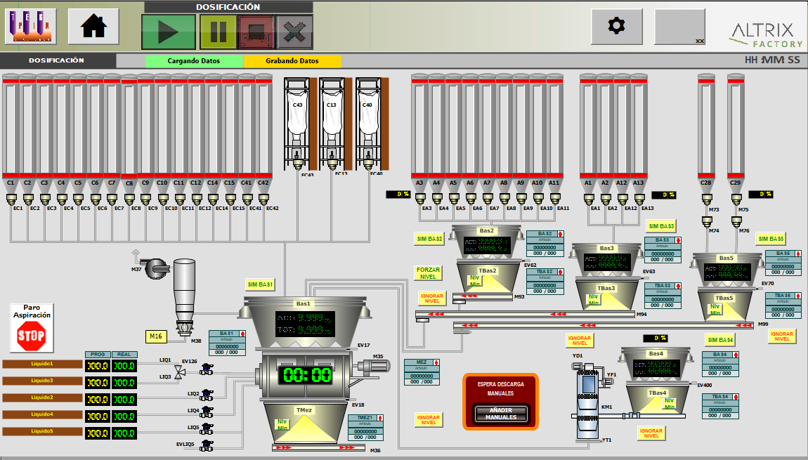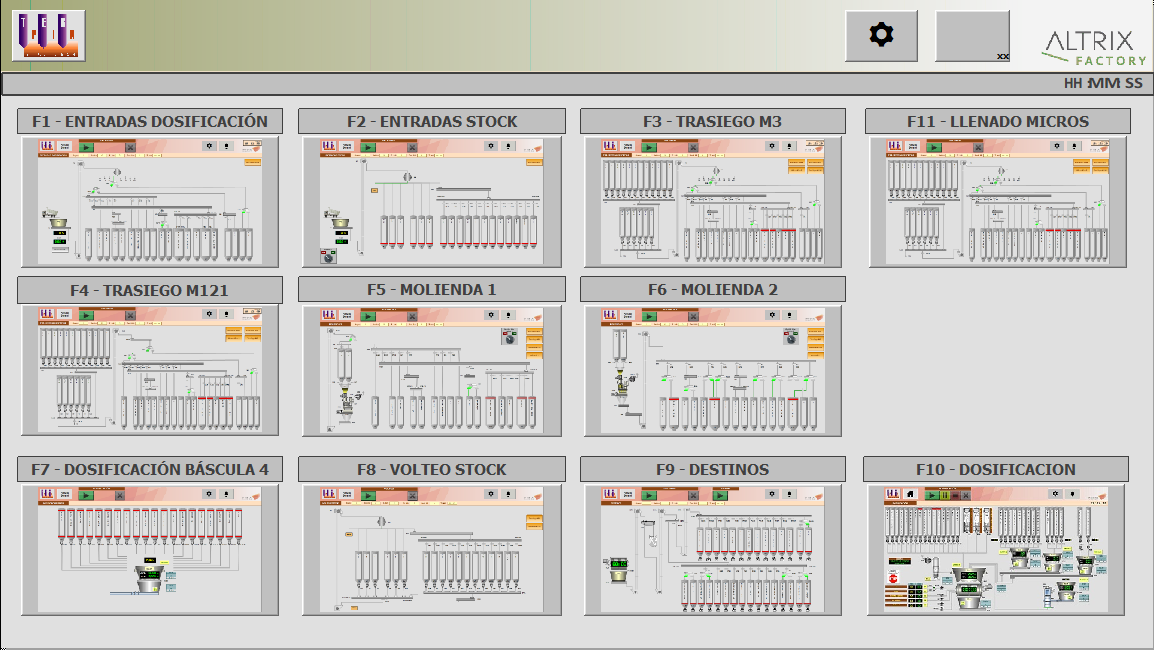 - Más de 10 sinópticos por áreas (dosificación, molienda, stock, entradas, básculas, etc.)